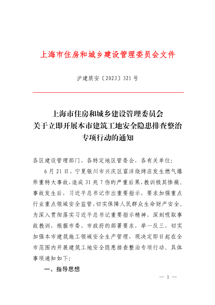 6月21日,宁夏银川市兴庆区富洋烧烤店发生燃气爆炸重特大事故,造成31死7伤的严重后果,教训极其惨痛。事故发生后,习近平总书记作出重要指示,要求加强重点行业重点领域安全监管,切实保障人民群众生命财产安全。为深入贯彻落实习近平总书记重要指示精神,深刻吸取事故教训,根据市委、市政府的部署要求,举一反三,切实加强本市建筑施工领域安全生产管理,现决定即日起在全市范围内开展建筑工地安全隐患排查整治专项行动。具体事项通知如下: