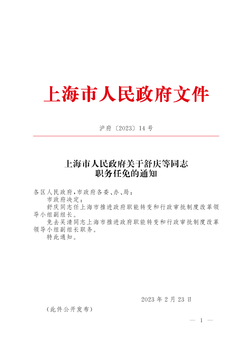 舒庆同志任上海市推进政府职能转变和行政审批制度改革领导小组副组长。