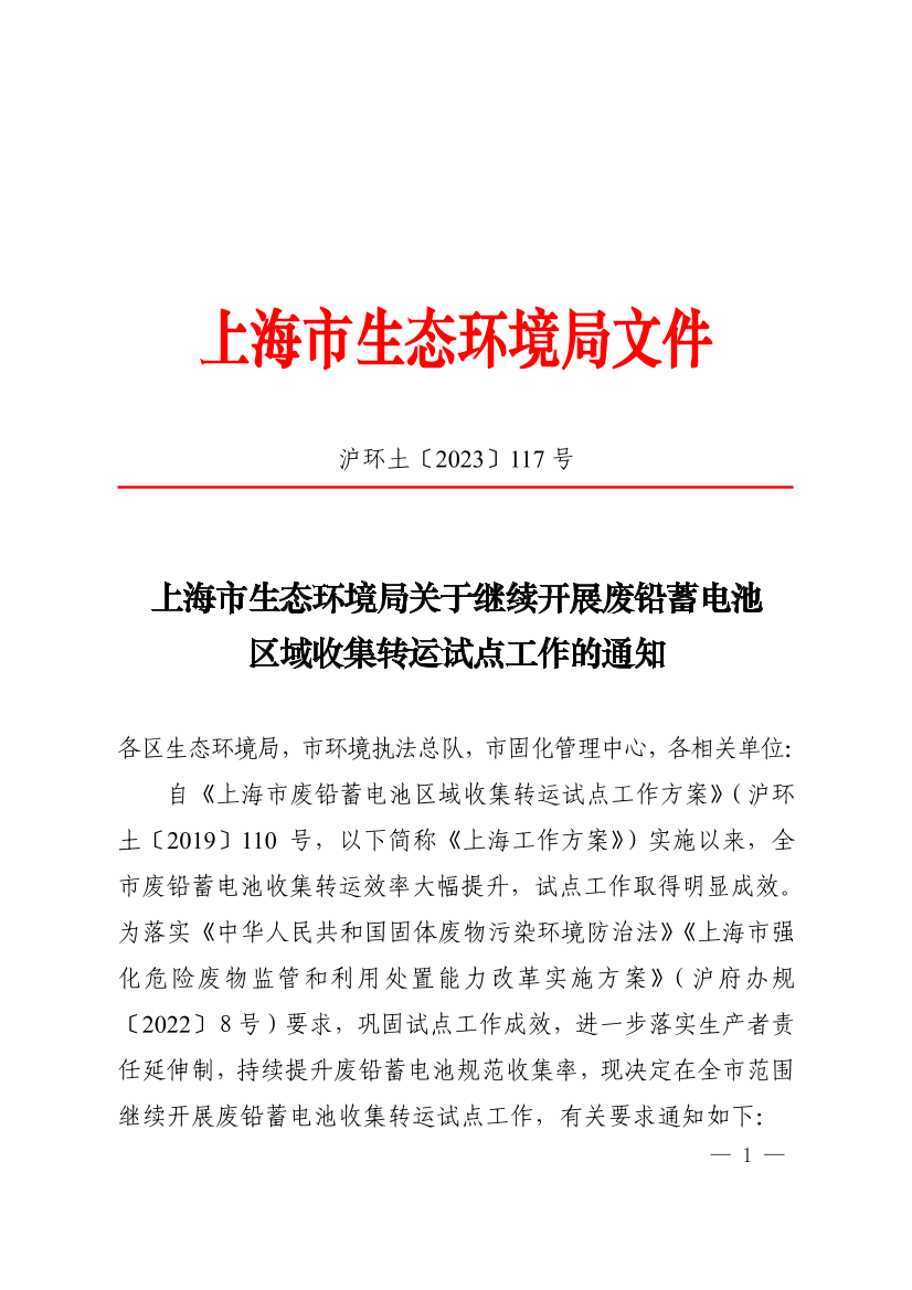 自《上海市废铅蓄电池区域收集转运试点工作方案》(沪环土〔2019〕110 号,以下简称《上海工作方案》)实施以来,全市废铅蓄电池收集转运效率大幅提升,试点工作取得明显成效。为落实《中华人民共和国固体废物污染环境防治法》《上海市强化危险废物监管和利用处置能力改革实施方案》(沪府办规〔2022〕8号)要求,巩固试点工作成效,进一步落实生产者责任延伸制,持续提升废铅蓄电池规范收集率,现决定在全市范围继续开展废铅蓄电池收集转运试点工作,有关要求通知如下: