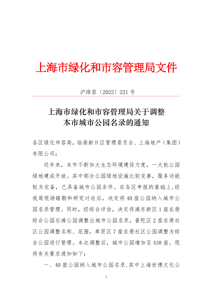 近年来,本市不断加大生态环境建设力度,一大批公园绿地建成开放。其中部分公园绿地设施比较完善,服务功能较为完备,已具备城市公园条件。在各区申报的基础上,经我局现场踏勘和研究讨论后,决定将40座公园纳入城市公园名录管理。同时,经综合评估,决定将浦东新区1座在册综合公园后滩公园调整出城市公园名录,普陀区2座在册社区公园调整名称、范围,奉贤区7座在册社区公园调整为综合公园进行管理。本次调整后,城市公园增加至438座。现将有关要求通知如下: