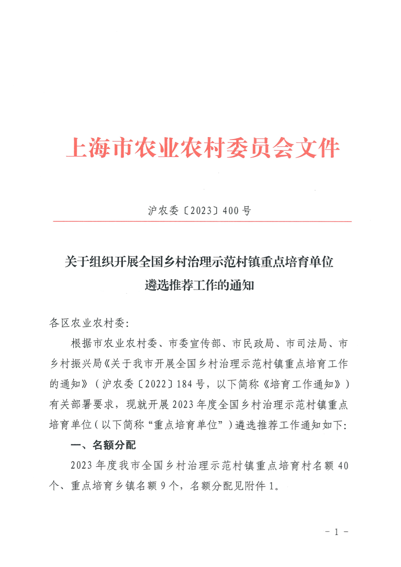 根据市农业农村委、市委宣传部、市民政局、市司法局、市乡村振兴局《关于我市开展全国乡村治理示范村镇重点培育工作的通知》(沪农委〔2022〕184号,以下简称《培育工作通知》)有关部署要求,现就开展2023年度全国乡村治理示范村镇重点培育单位(以下简称“重点培育单位”)遴选推荐工作通知如下: