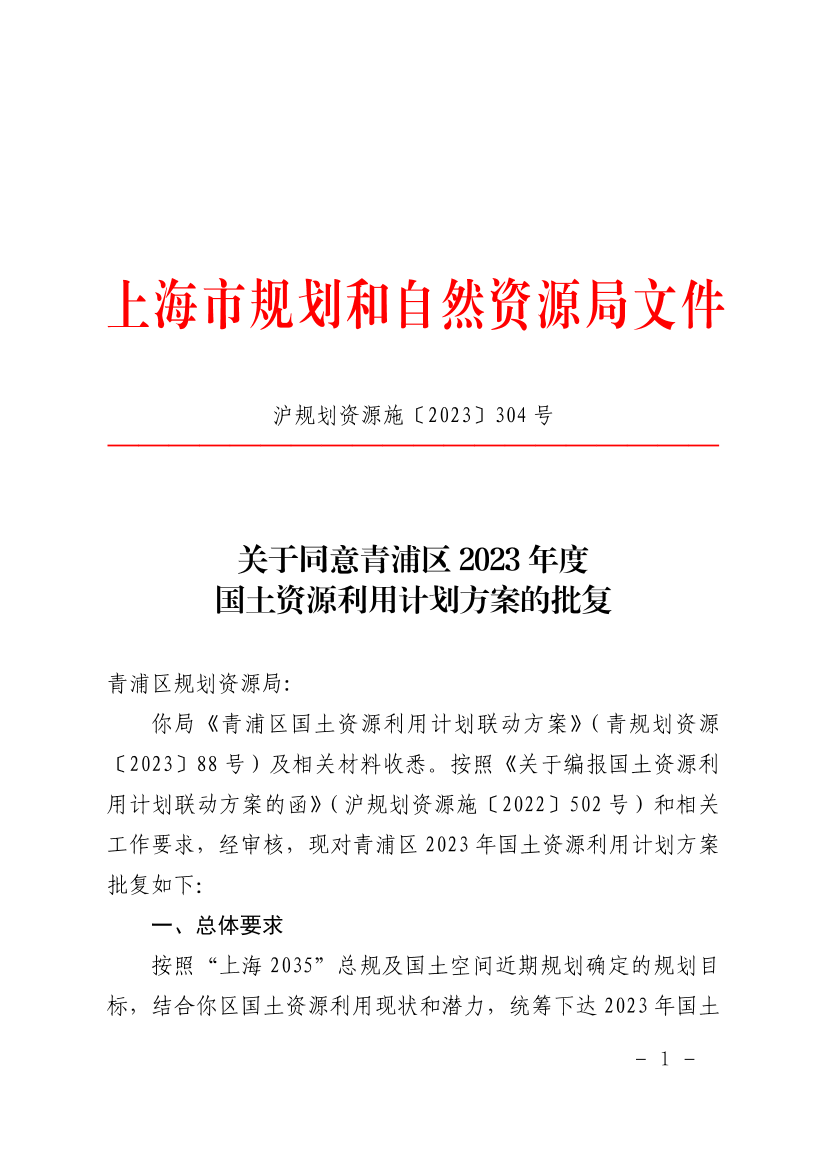 你局《青浦区国土资源利用计划联动方案》(青规划资源〔2023〕88号)及相关材料收悉。按照《关于编报国土资源利用计划联动方案的函》(沪规划资源施〔2022〕502号)和相关工作要求,经审核,现对青浦区2023年国土资源利用计划方案批复如下: