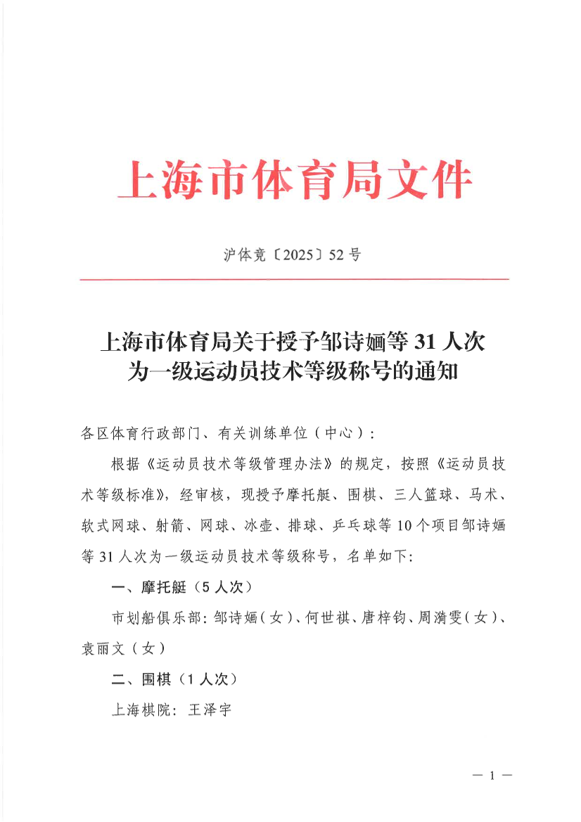 根据《运动员技术等级管理办法》的规定,按照《运动员技术等级标准》,经审核,现授予摩托艇、围棋、三人篮球、马术、软式网球、射箭、网球、冰壶、排球、乒乓球等10个项目邹诗婳等31人次为一级运动员技术等级称号,名单如下: