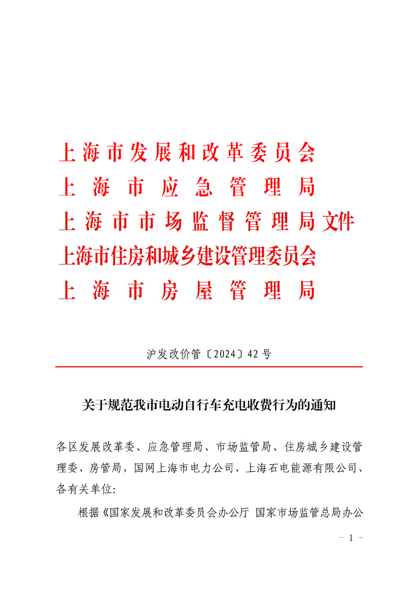 根据《国家发展和改革委员会办公厅 国家市场监管总局办公厅关于规范电动自行车充电收费行为的通知》(发改办价格〔2024〕537号)、《上海市人民政府办公厅关于印发〈上海市电动自行车安全隐患全链条整治行动实施方案〉的通知》(沪府办〔2024〕34号)有关要求,为规范电动自行车充电收费行为,引导充电服务收费标准合理形成,推动降低群众充电负担,现就有关事项通知如下。