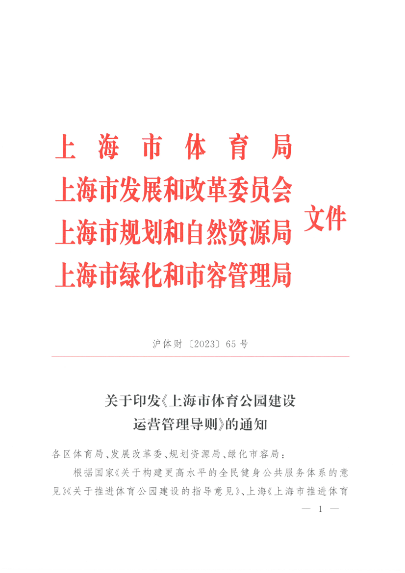 根据国家《关于构建更高水平的全民健身公共服务体系的意见》《关于推进体育公园建设的指导意见》、上海《上海市推进体育公园建设实施方案》,市体育局、市发展改革委、市规划资源局、市绿化市容局制定了《上海市体育公园建设运营管理导则》,现印发给你们,请认真按照执行。