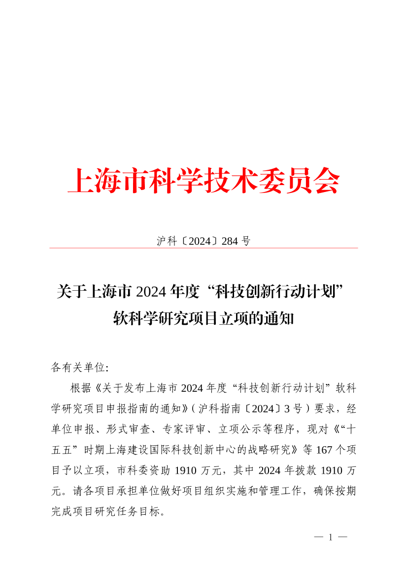 根据《关于发布上海市2024年度“科技创新行动计划”软科学研究项目申报指南的通知》(沪科指南〔2024〕3号)要求,经单位申报、形式审查、专家评审、立项公示等程序,现对《“十五五”时期上海建设国际科技创新中心的战略研究》等167个项目予以立项,市科委资助1910万元,其中2024年拨款1910万元。请各项目承担单位做好项目组织实施和管理工作,确保按期完成项目研究任务目标。