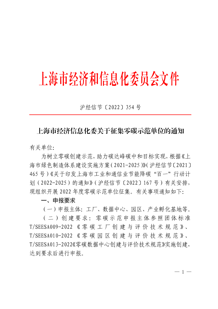 为树立零碳创建示范,助力碳达峰碳中和目标实现,根据《上海市绿色制造体系建设实施方案(2021-2025)》(沪经信节〔2021〕465号)《关于印发上海市工业和通信业节能降碳“百一”行动计划(2022-2025)的通知》(沪经信节〔2022〕167号)有关安排,现组织开展2022年度零碳示范单位征集。有关事项通知如下: