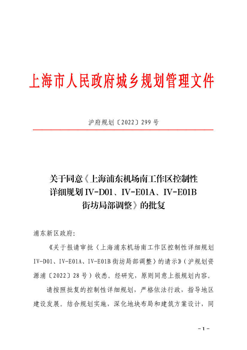 《关于报请审批〈上海浦东机场南工作区控制性详细规划IV-D01、IV-E01A、IV-E01B街坊局部调整〉的请示》(沪规划资源浦〔2022〕28号)收悉。经研究,原则同意上报规划内容。