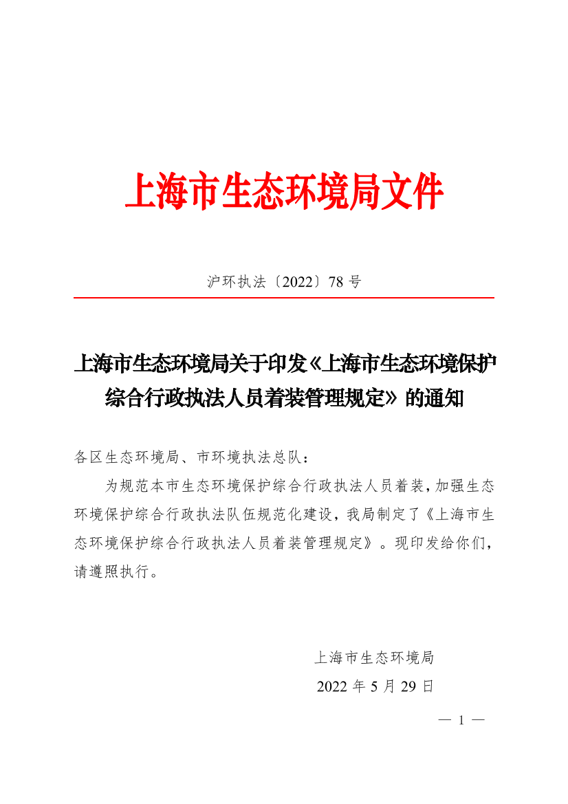 为规范本市生态环境保护综合行政执法人员着装,加强生态环境保护综合行政执法队伍规范化建设,我局制定了《上海市生态环境保护综合行政执法人员着装管理规定》。现印发给你们,请遵照执行。