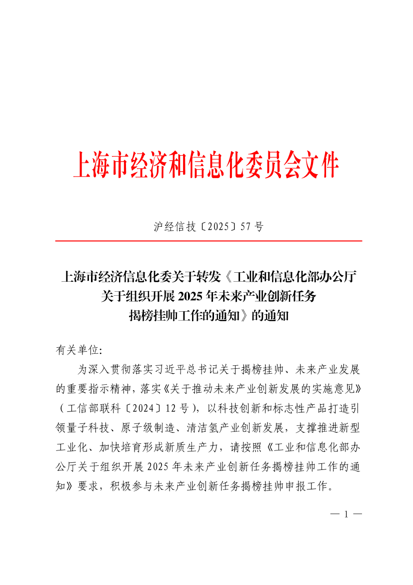 为深入贯彻落实习近平总书记关于揭榜挂帅、未来产业发展的重要指示精神,落实《关于推动未来产业创新发展的实施意见》(工信部联科〔2024〕12号),以科技创新和标志性产品打造引领量子科技、原子级制造、清洁氢产业创新发展,支撑推进新型工业化、加快培育形成新质生产力,请按照《工业和信息化部办公厅关于组织开展2025年未来产业创新任务揭榜挂帅工作的通知》要求,积极参与未来产业创新任务揭榜挂帅申报工作。