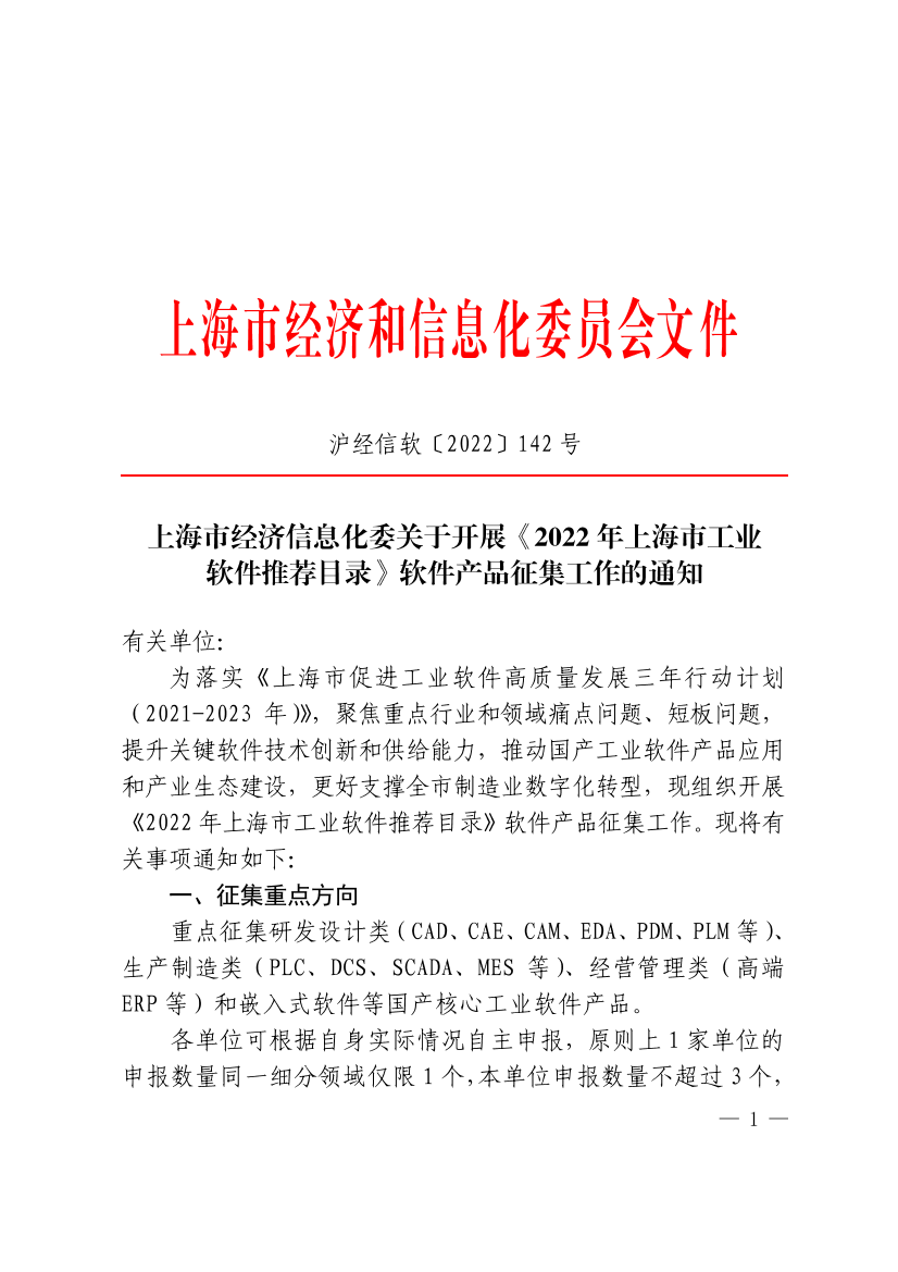 为落实《上海市促进工业软件高质量发展三年行动计划(2021-2023年)》,聚焦重点行业和领域痛点问题、短板问题,提升关键软件技术创新和供给能力,推动国产工业软件产品应用和产业生态建设,更好支撑全市制造业数字化转型,现组织开展《2022年上海市工业软件推荐目录》软件产品征集工作。现将有关事项通知如下: