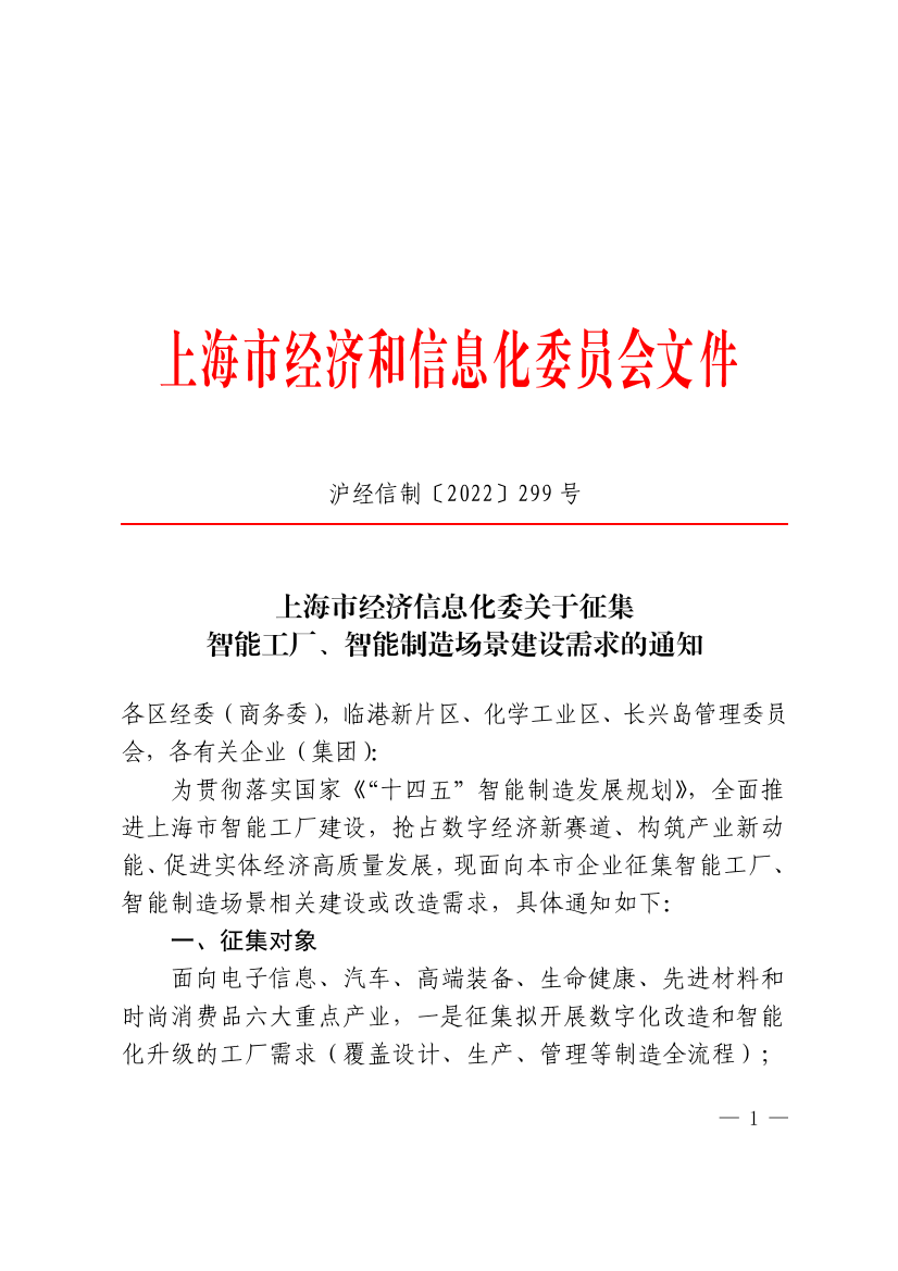 为贯彻落实国家《“十四五”智能制造发展规划》,全面推进上海市智能工厂建设,抢占数字经济新赛道、构筑产业新动能、促进实体经济高质量发展,现面向本市企业征集智能工厂、智能制造场景相关建设或改造需求,具体通知如下: