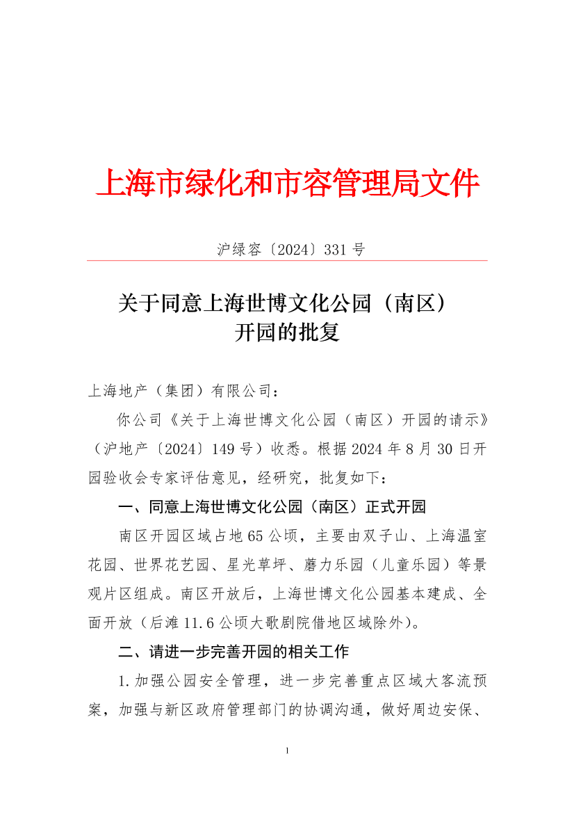 你公司《关于上海世博文化公园(南区)开园的请示》(沪地产〔2024〕149号)收悉。根据2024年8月30日开园验收会专家评估意见,经研究,批复如下: