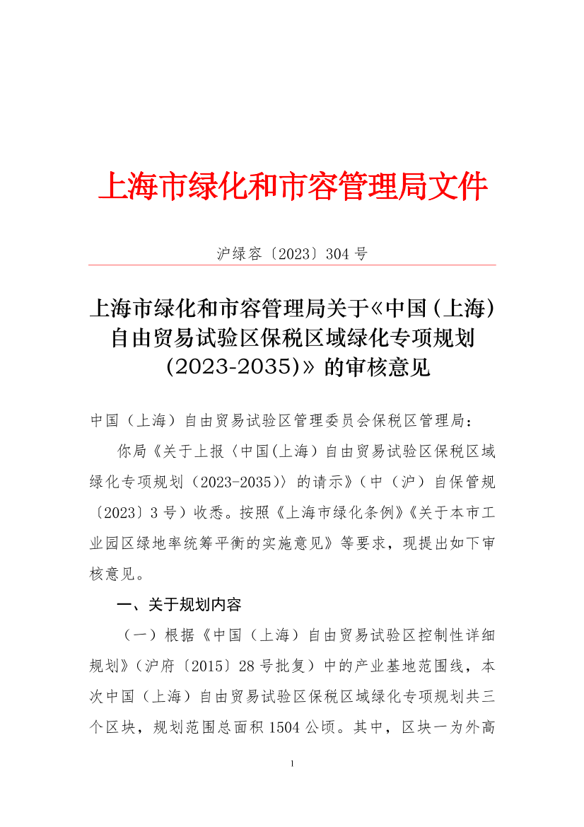 你局《关于上报〈中国(上海)自由贸易试验区保税区域绿化专项规划(2023-2035)〉的请示》(中(沪)自保管规〔2023〕3号)收悉。按照《上海市绿化条例》《关于本市工业园区绿地率统筹平衡的实施意见》等要求,现提出如下审核意见。