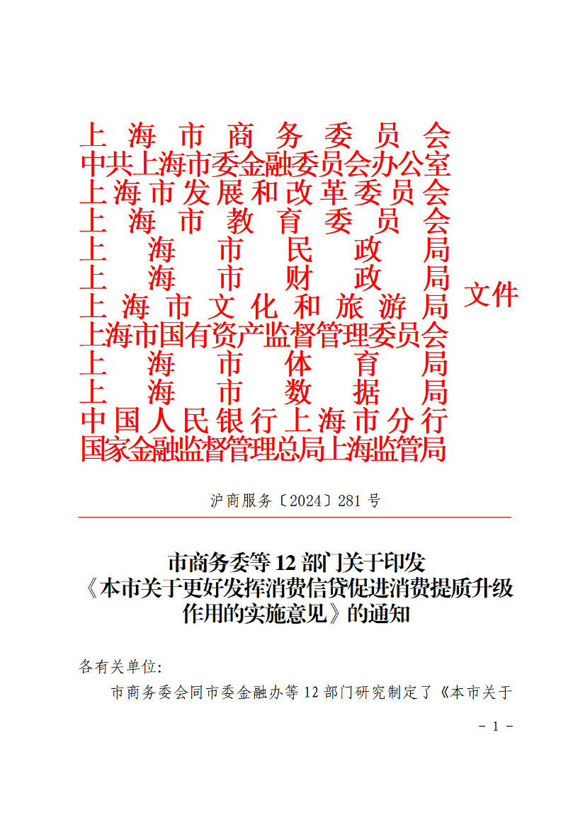 根据《国务院关于促进服务消费高质量发展的意见》(国发〔2024〕18号)、十二届市委五次全会精神和市政府办公厅《关于印发〈本市促进服务消费提质扩容的实施方案〉的通知》(沪府办发〔2024〕5号),更好发挥消费信贷在本市促进消费提质升级中的积极作用,加快推进上海国际消费中心城市建设,提出实施意见如下。