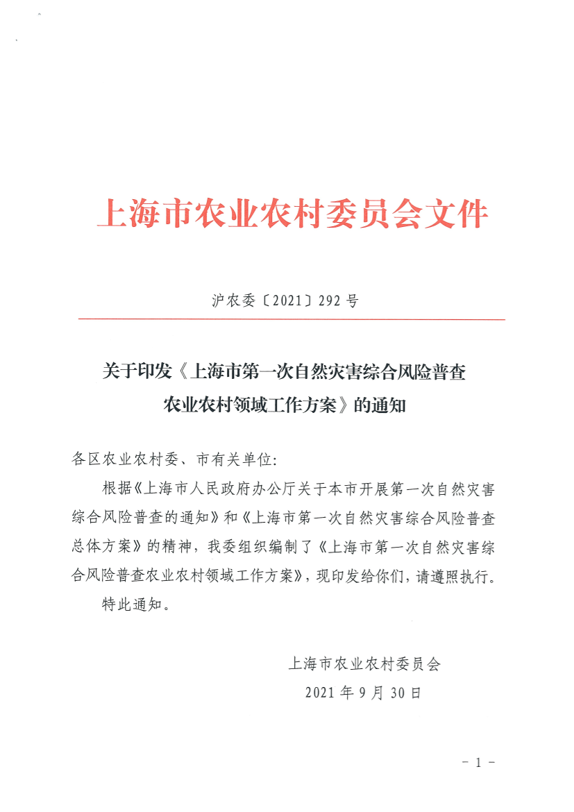根据《上海市人民政府办公厅关于本市开展第一次自然灾害综合风险普查的通知》和《上海市第一次自然灾害综合风险普查总体方案》的精神,我委组织编制了《上海市第一次自然灾害综合风险普查农业农村领域工作方案》,现印发给你们,请遵照执行。
