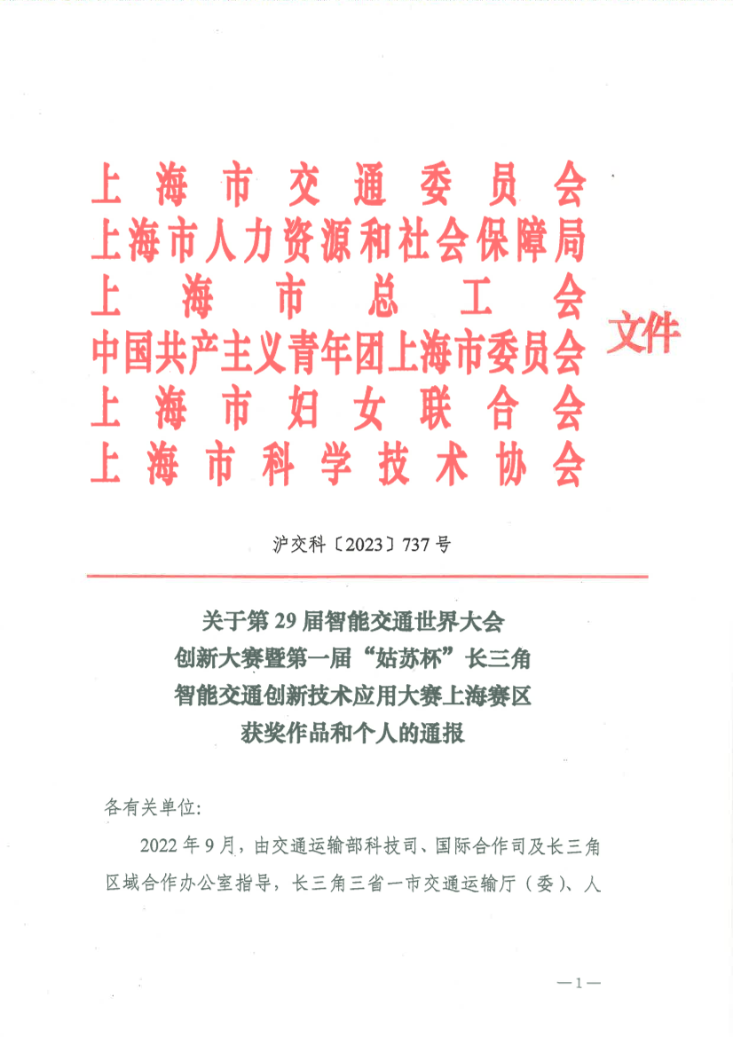 2022年9月,由交通运输部科技司、国际合作司及长三角区域合作办公室指导,长三角三省一市交通运输厅(委)、人力资源和社会保障厅(局)、总工会、共青团省(市)委、妇女联合会、苏州市人民政府、江苏省科学技术协会、上海市科学技术协会、江苏省综合交通运输学会联合主办第29届智能交通世界大会创新大赛暨第一届“姑苏杯”长三角智能交通创新技术应用大赛。在大赛组委会的领导下,在沪苏浙皖及高校五个赛区组委会的共同努力下,大赛自启动以来得到社会的广泛关注和积极参与,共有1328项作品报名,其中上海赛区117项。截至2023年7月,大赛评审委员会按照评审标准和程序圆满完成初赛、复赛和决赛评审工作。上海赛区设置赛区特等奖1项,一等奖1项,二等奖3项,三等奖4项,优秀奖7项。根据大赛奖励办法,现对上海赛区获奖作品和个人予以通报。