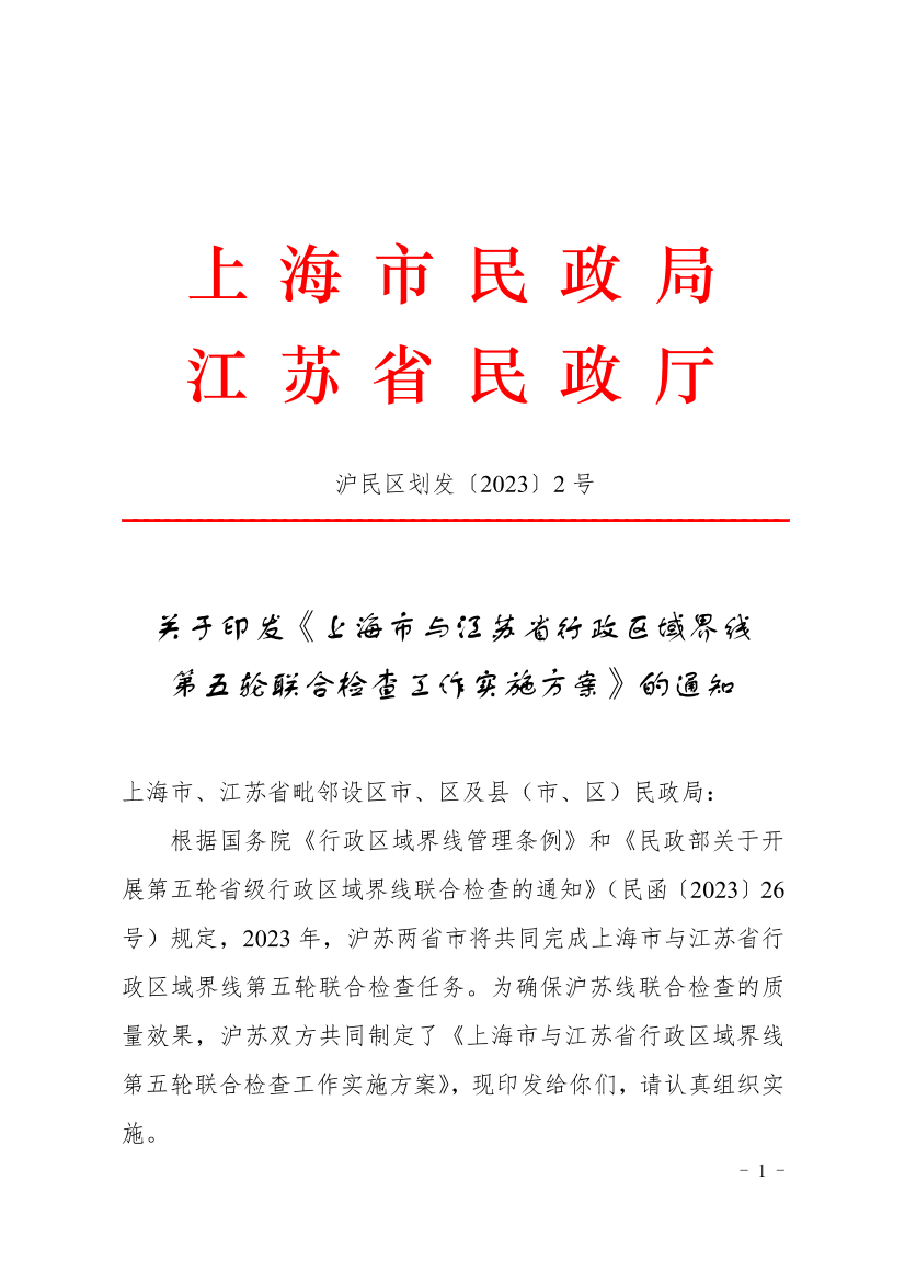 根据国务院《行政区域界线管理条例》(国务院令第353号)和民政部《省级行政区域界线联合检查实施办法》(民政部令第28号)规定,按照《民政部关于开展第五轮省级行政区域界线联合检查的通知》(民函〔2023〕26号)要求,2023年,上海市、江苏省将共同完成上海市与江苏省行政区域界线联合检查(以下简称“沪苏线联检”)任务。为确保沪苏线联检质量效果,更好服务长三角一体化发展,结合两省市边界线实际情况,经商定,制定本实施方案。
