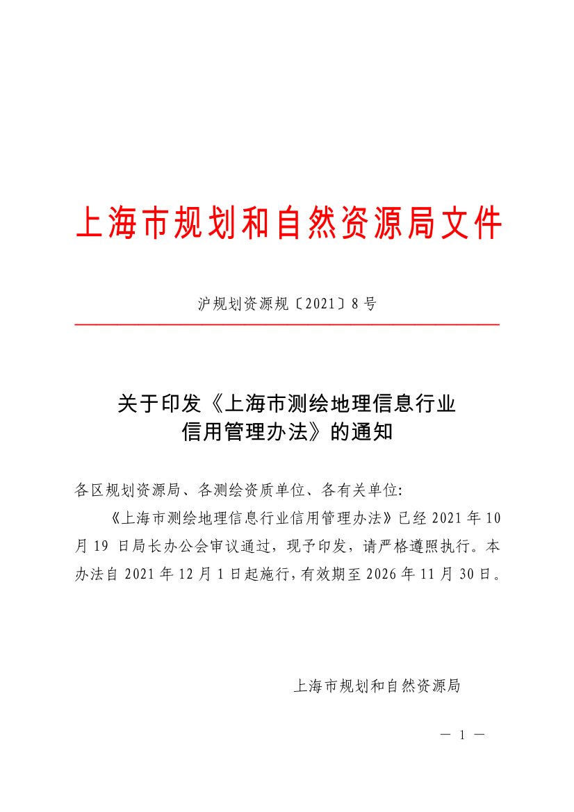 《上海市测绘地理信息行业信用管理办法》已经2021年10月19 日局长办公会审议通过,现予印发,请严格遵照执行。本办法自2021年12月1日起施行,有效期至2026年11月30日。
