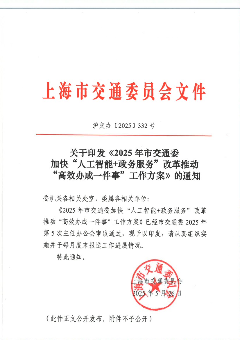 《2025年市交通委加快“人工智能+政务服务”改革推动“高效办成一件事”工作方案》已经市交通委2025年第5次主任办公会审议通过,现予以印发,请认真组织实施并于每月度末报送工作进展情况。