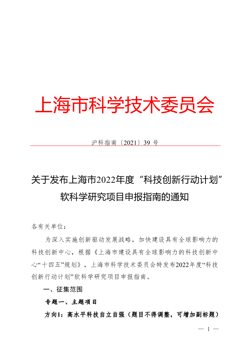 为深入实施创新驱动发展战略,加快建设具有全球影响力的科技创新中心,根据《上海市建设具有全球影响力的科技创新中心“十四五”规划》,上海市科学技术委员会特发布2022年度“科技创新行动计划”软科学研究项目申报指南。