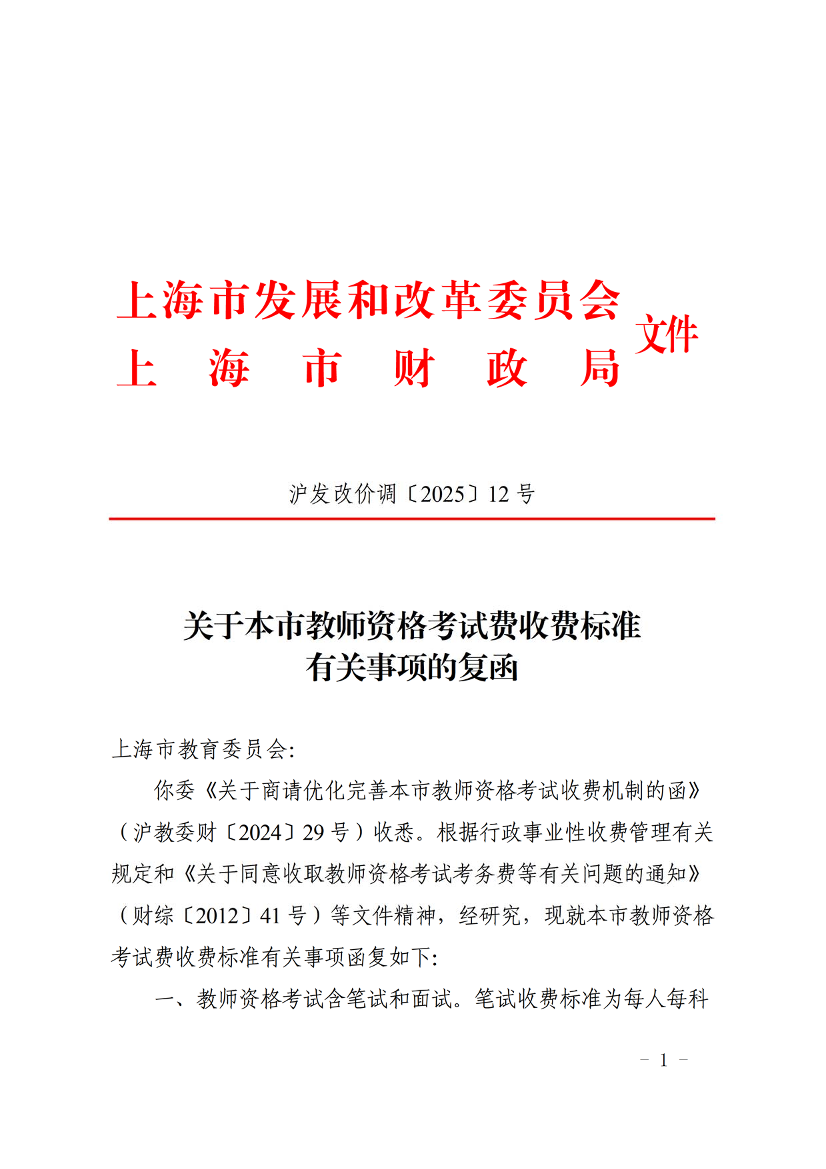 你委《关于商请优化完善本市教师资格考试收费机制的函》(沪教委财〔2024〕29号)收悉。根据行政事业性收费管理有关规定和《关于同意收取教师资格考试考务费等有关问题的通知》(财综〔2012〕41号)等文件精神,经研究,现就本市教师资格考试费收费标准有关事项函复如下: