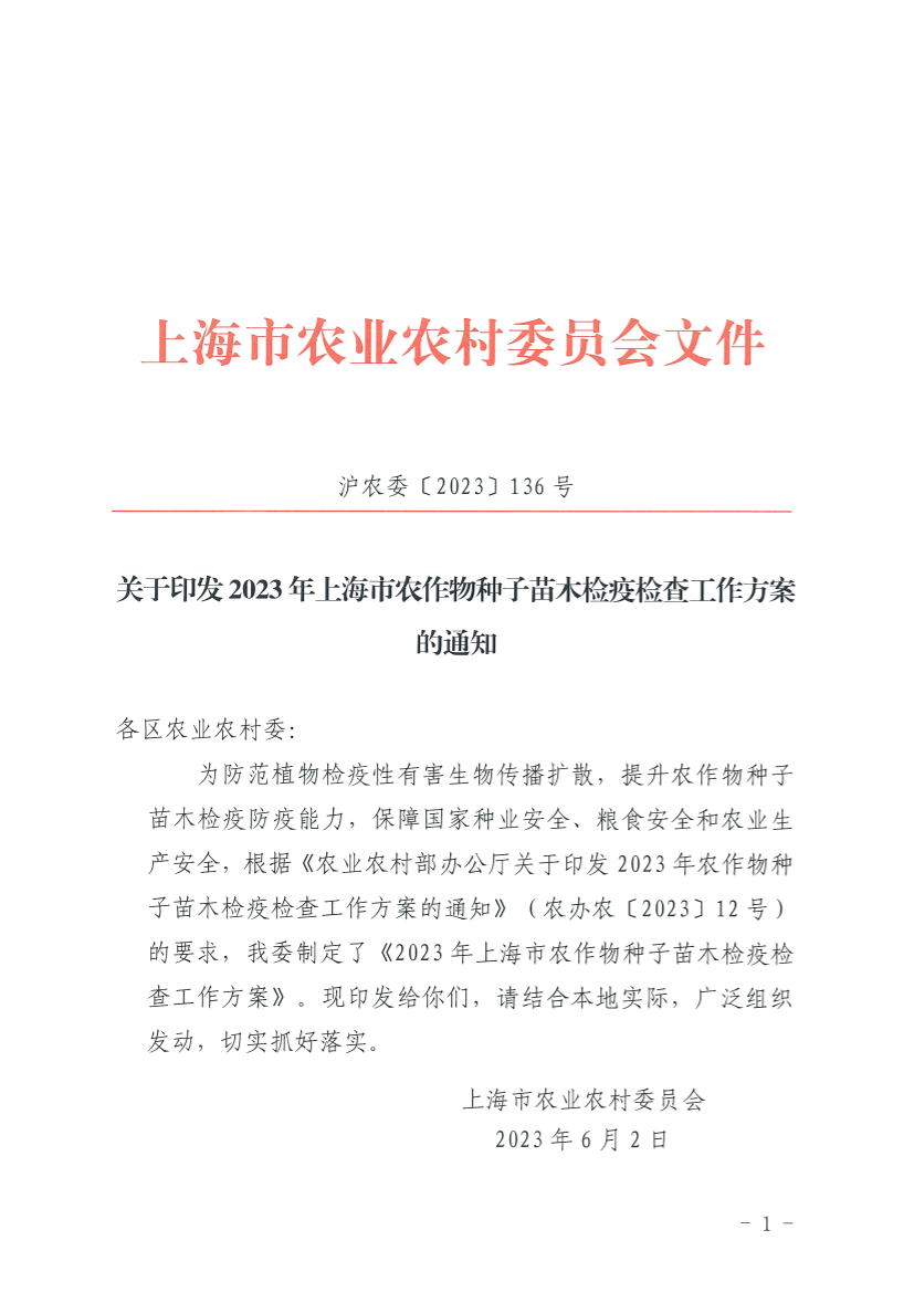 为防范植物检疫性有害生物传播扩散,提升农作物种子苗木检疫防疫能力,保障国家种业安全、粮食安全和农业生产安全,根据《农业农村部办公厅关于印发2023年农作物种子苗木检疫检查工作方案的通知》(农办农〔2023〕12号)的要求,我委制定了《2023年上海市农作物种子苗木检疫检查工作方案》。现印发给你们,请结合本地实际,广泛组织发动,切实抓好落实。