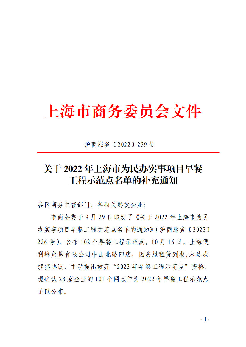 市商务委于9月29日印发了《关于2022年上海市为民办实事项目早餐工程示范点名单的通知》(沪商服务〔2022〕226号),公布102个早餐工程示范点。10月16日,上海便利峰贸易有限公司中山北路四店,因房屋租赁到期,末达成续签协议,主动提出放弃“2022年早餐工程示范点”资格。现确认28家企业的101个网点作为2022年早餐工程示范点予以公布。