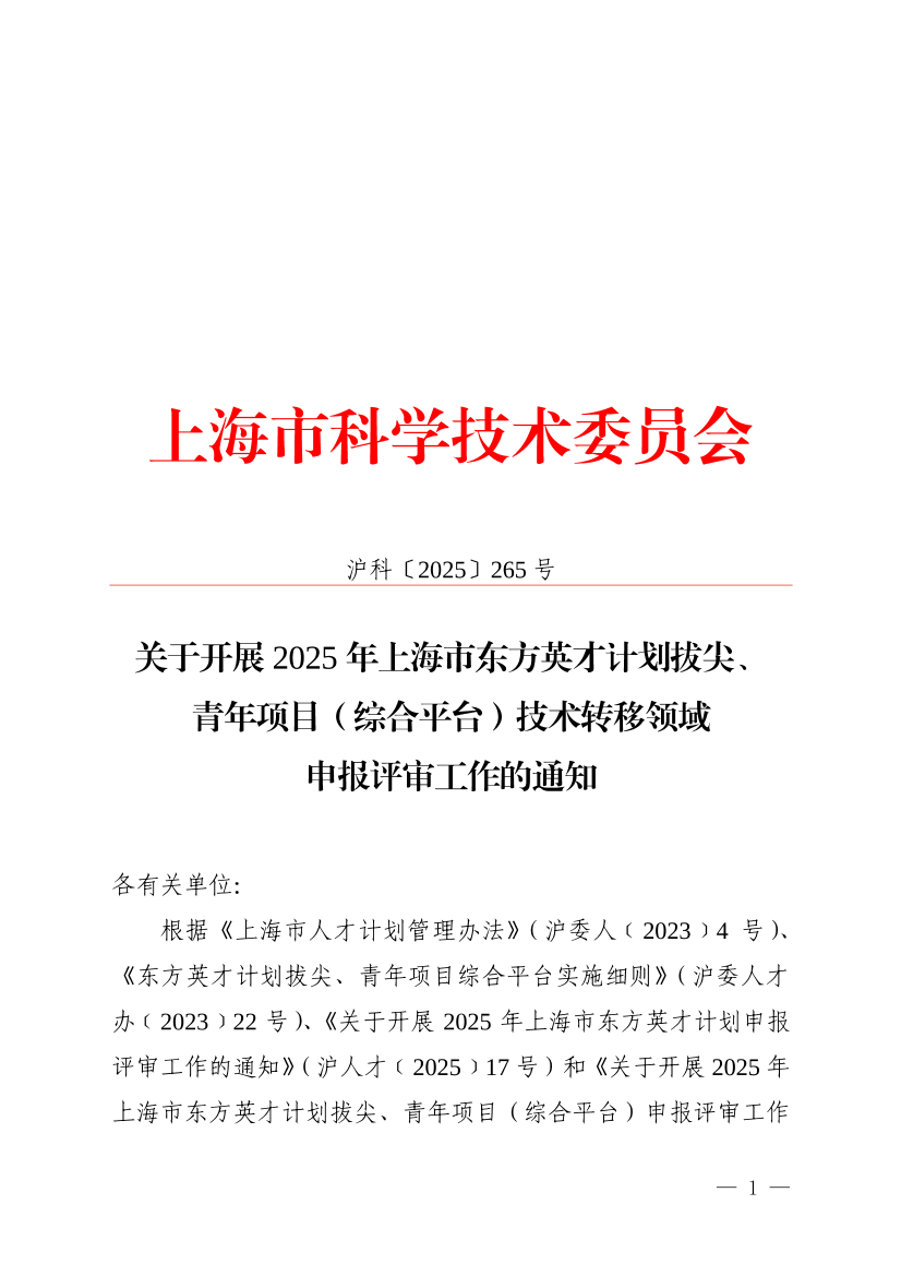 根据《上海市人才计划管理办法》(沪委人﹝2023﹞4号)、《东方英才计划拔尖、青年项目综合平台实施细则》(沪委人才办﹝2023﹞22号)、《关于开展2025年上海市东方英才计划申报评审工作的通知》(沪人才﹝2025﹞17号)和《关于开展2025年上海市东方英才计划拔尖、青年项目(综合平台)申报评审工作的通知》(沪人才﹝2025﹞20号)等有关文件要求,现启动2025年东方英才计划拔尖、青年项目(综合平台)技术转移领域申报评审工作,有关事项通知如下:
