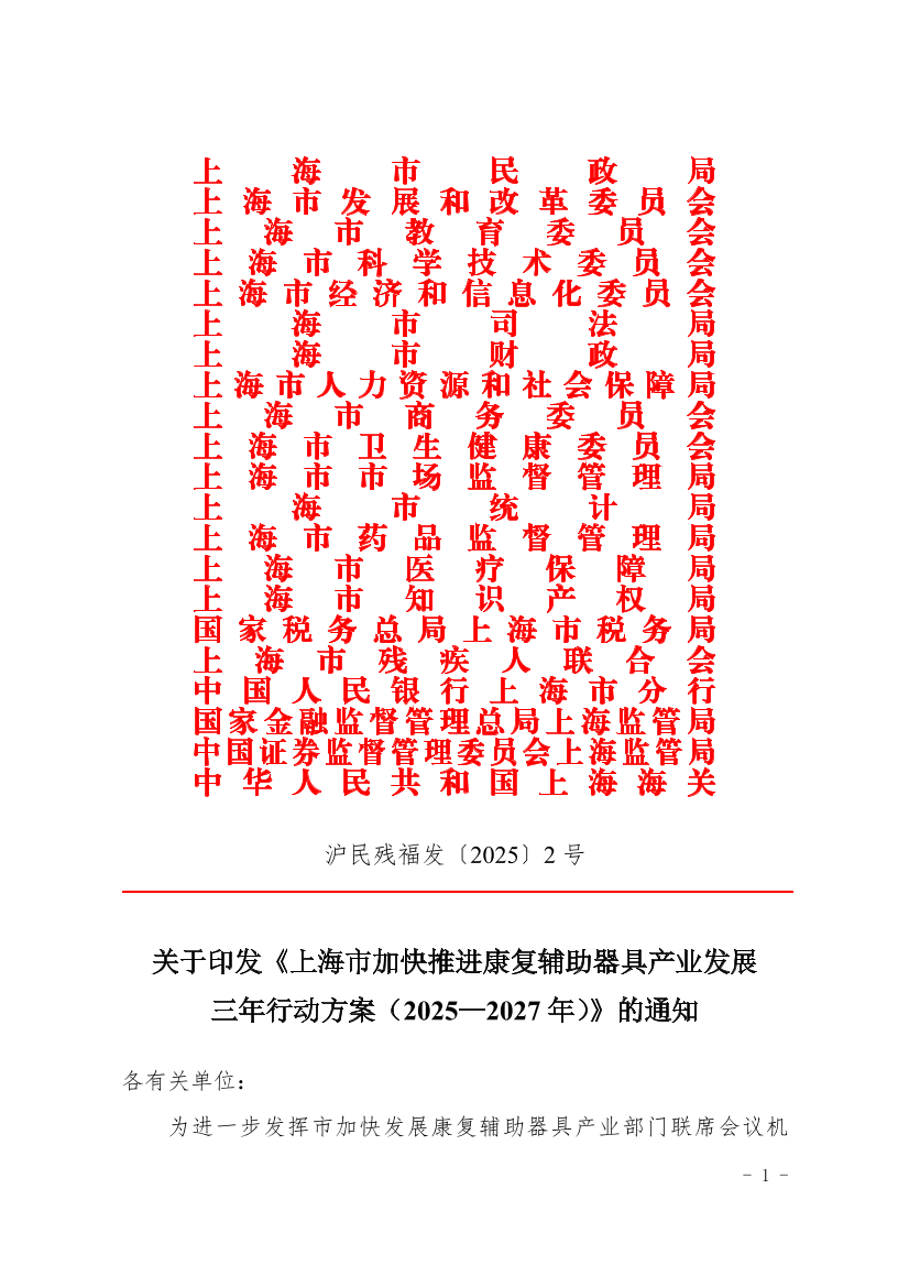 为进一步发挥市加快发展康复辅助器具产业部门联席会议机制,聚焦促创新、扩消费,用足用好各部门扶持政策,形成工作合力。现将《上海市加快推进康复辅助器具产业发展三年行动方案(2025—2027年)》印发给你们,请认真按照执行。