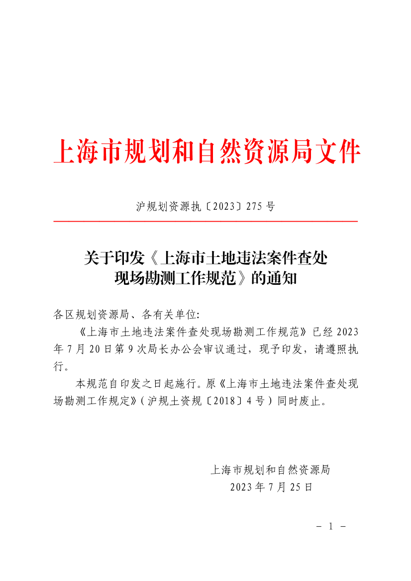 本规范自印发之日起施行。原《上海市土地违法案件查处现场勘测工作规定》(沪规土资规〔2018〕4号)同时废止。