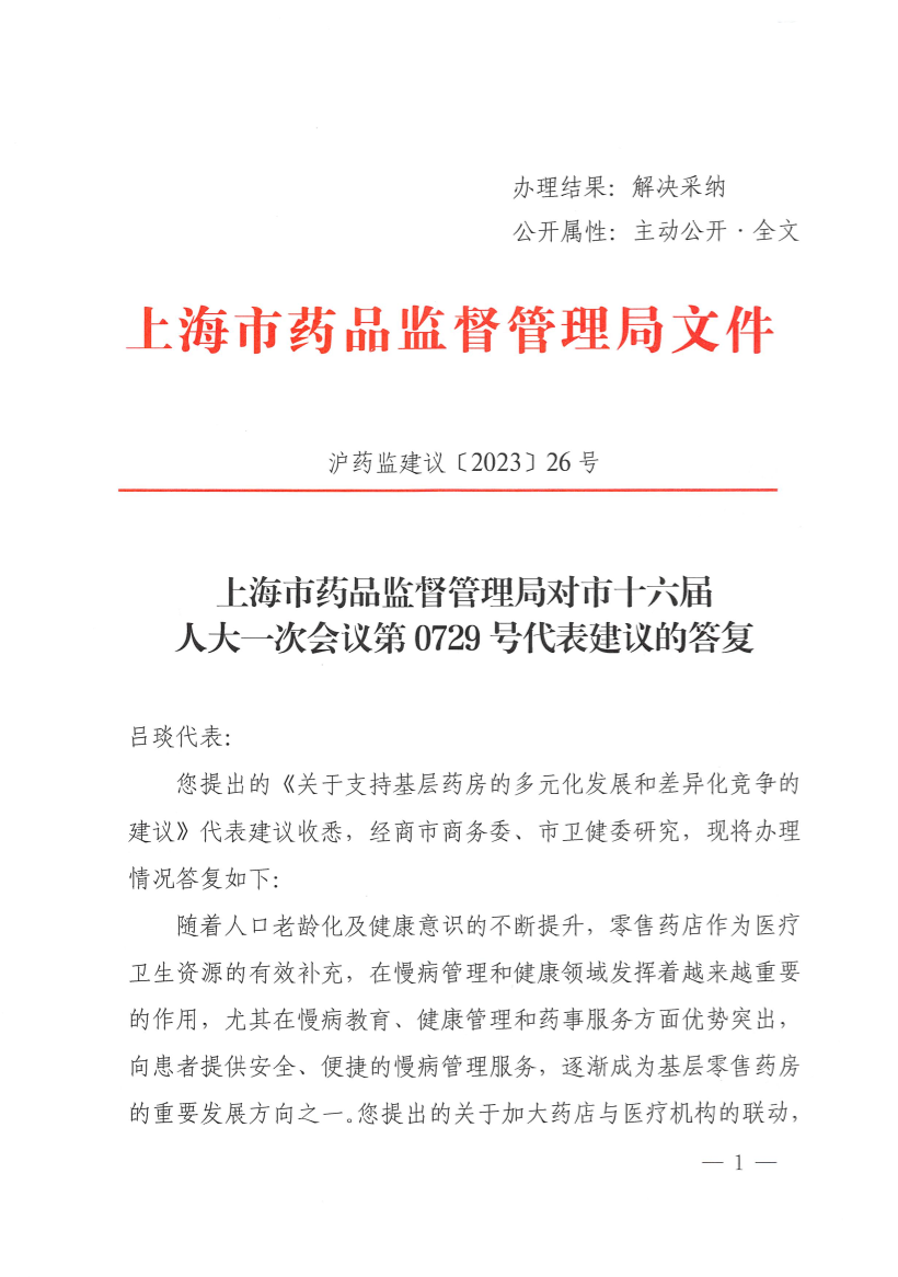您提出的《关于支持基层药房的多元化发展和差异化竞争的建议》代表建议收悉,经商市商务委、市卫健委研究,现将办理情况答复如下: