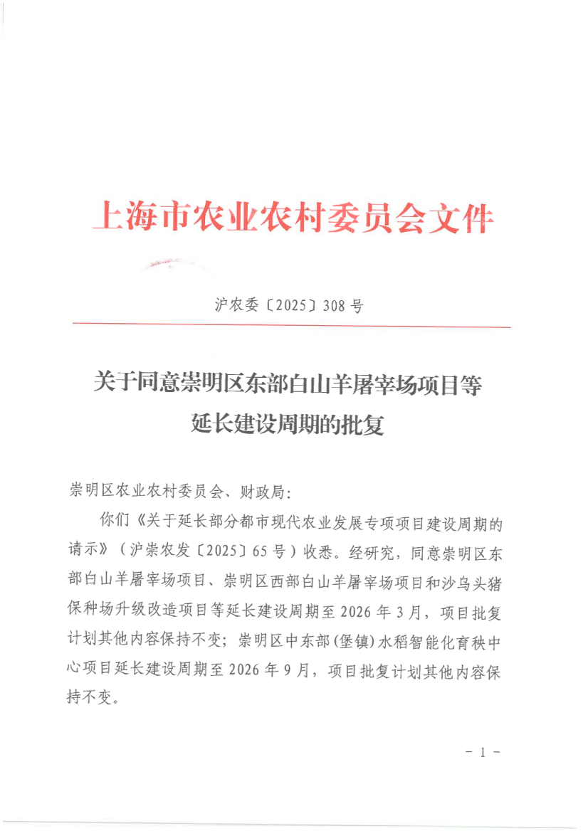 你们《关于延长部分都市现代农业发展专项项目建设周期的请示》(沪崇农发〔2025〕65号)收悉。经研究,同意崇明区东部白山羊屠宰场项目、崇明区西部白山羊屠宰场项目和沙乌头猪保种场升级改造项目等延长建设周期至2026年3月,项目批复计划其他内容保持不变;崇明区中东部(堡镇)水稻智能化育秧中心项目延长建设周期至2026年9月,项目批复计划其他内容保持不变。