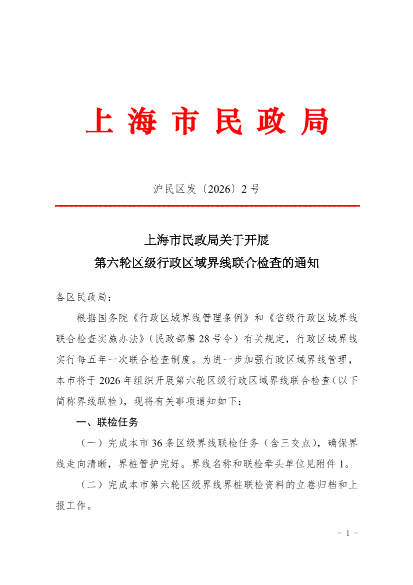 根据国务院《行政区域界线管理条例》和《省级行政区域界线联合检查实施办法》(民政部第28号令)有关规定,行政区域界线实行每五年一次联合检查制度。为进一步加强行政区域界线管理,本市将于2026年组织开展第六轮区级行政区域界线联合检查(以下简称界线联检),现将有关事项通知如下: