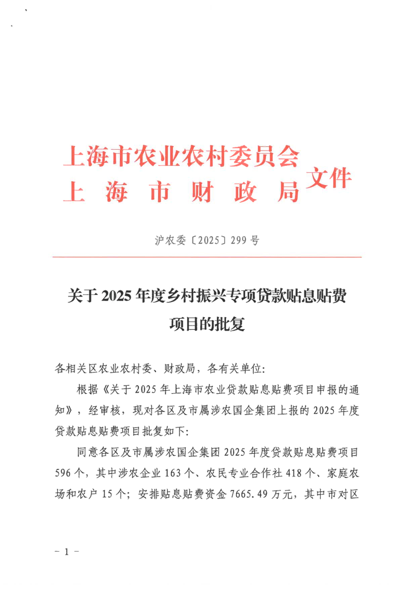 根据《关于2025年上海市农业贷款贴息贴费项目申报的通知》,经审核,现对各区及市属涉农国企集团上报的2025年度贷款贴息贴费项目批复如下: