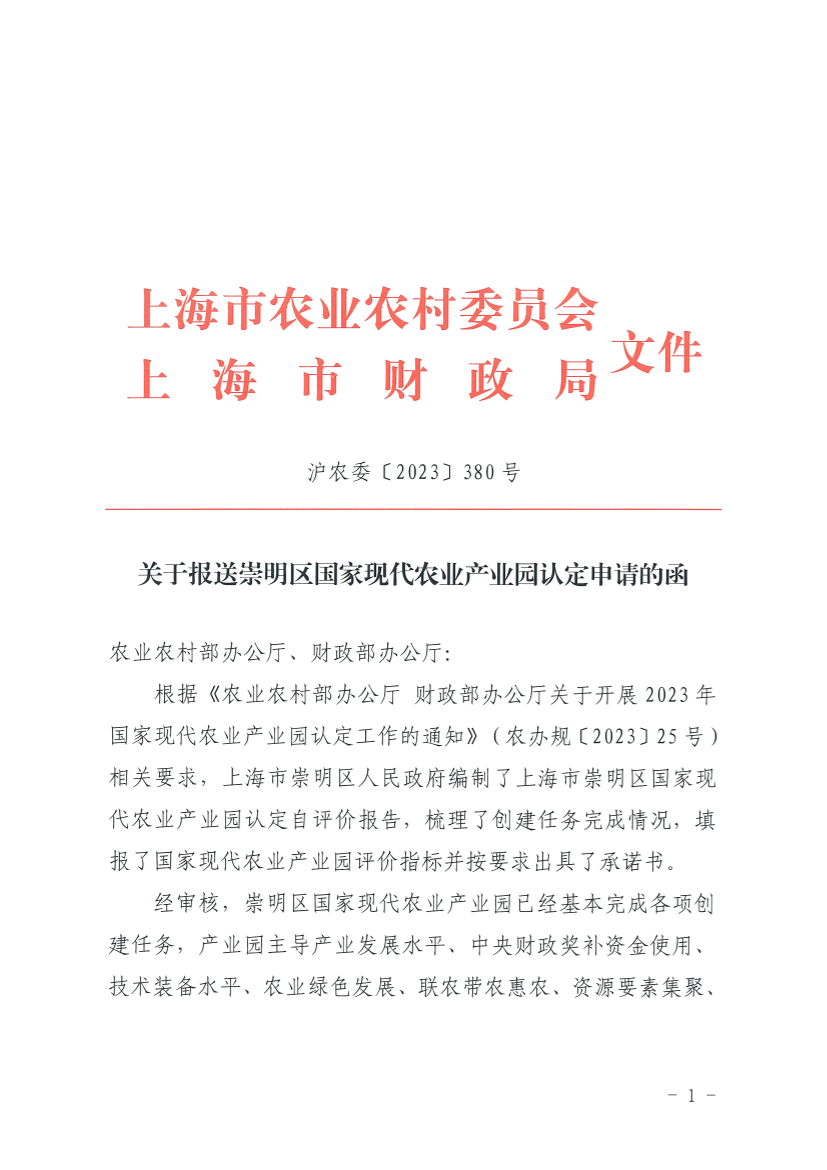 拟推荐崇明区国家现代农业产业园申请2023年国家现代农业产业园认定。