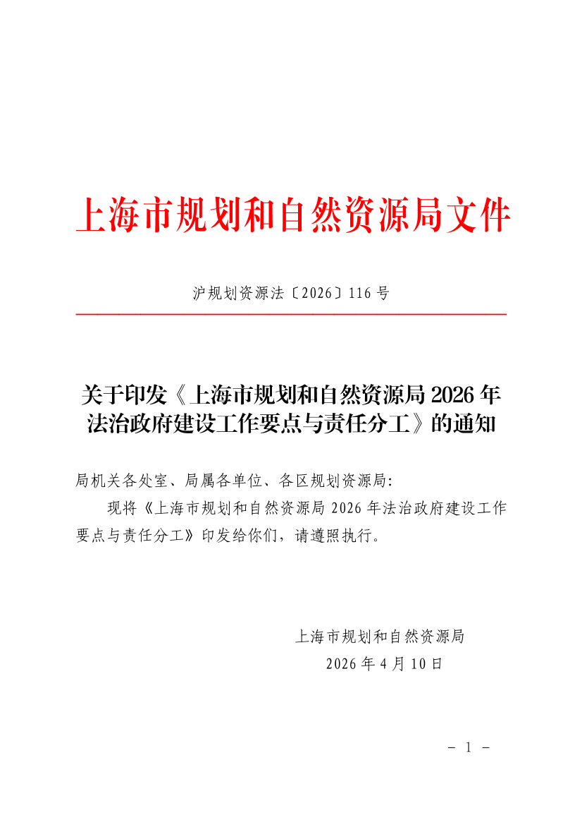 关于印发《上海市规划和自然资源局2026年法治政府建设工作要点与责任分工》的通知