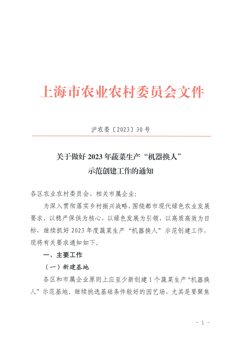 为深入贯彻落实乡村振兴战略,围绕都市现代绿色农业发展要求,以稳产保供为核心,以绿色发展为引领,以高质高效为目标,继续抓好2023年度蔬菜生产“机器换人”示范创建工作,现将有关要求通知如下。