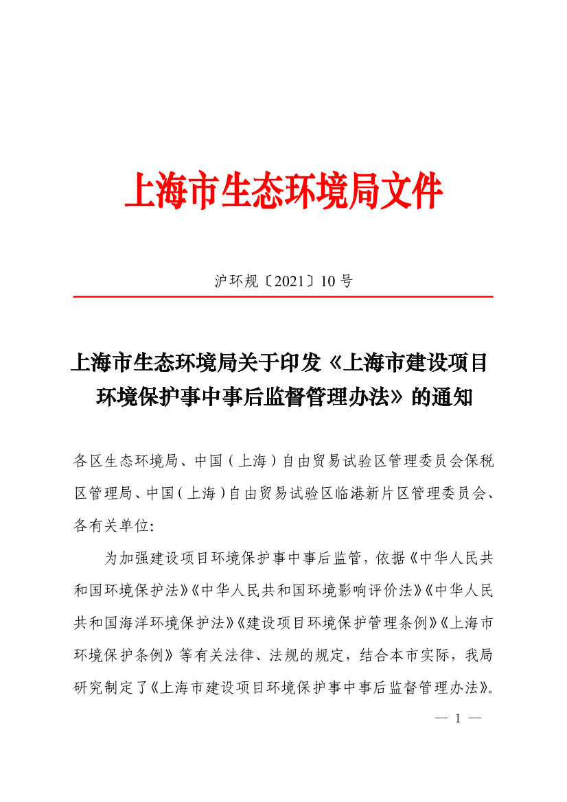 为加强生态环境保护工作,强化建设项目环境保护事中事后监督管理,依据《中华人民共和国环境保护法》《中华人民共和国环境影响评价法》《中华人民共和国海洋环境保护法》《建设项目环境保护管理条例》《上海市环境保护条例》等有关规定,结合本市实际,制定本办法。