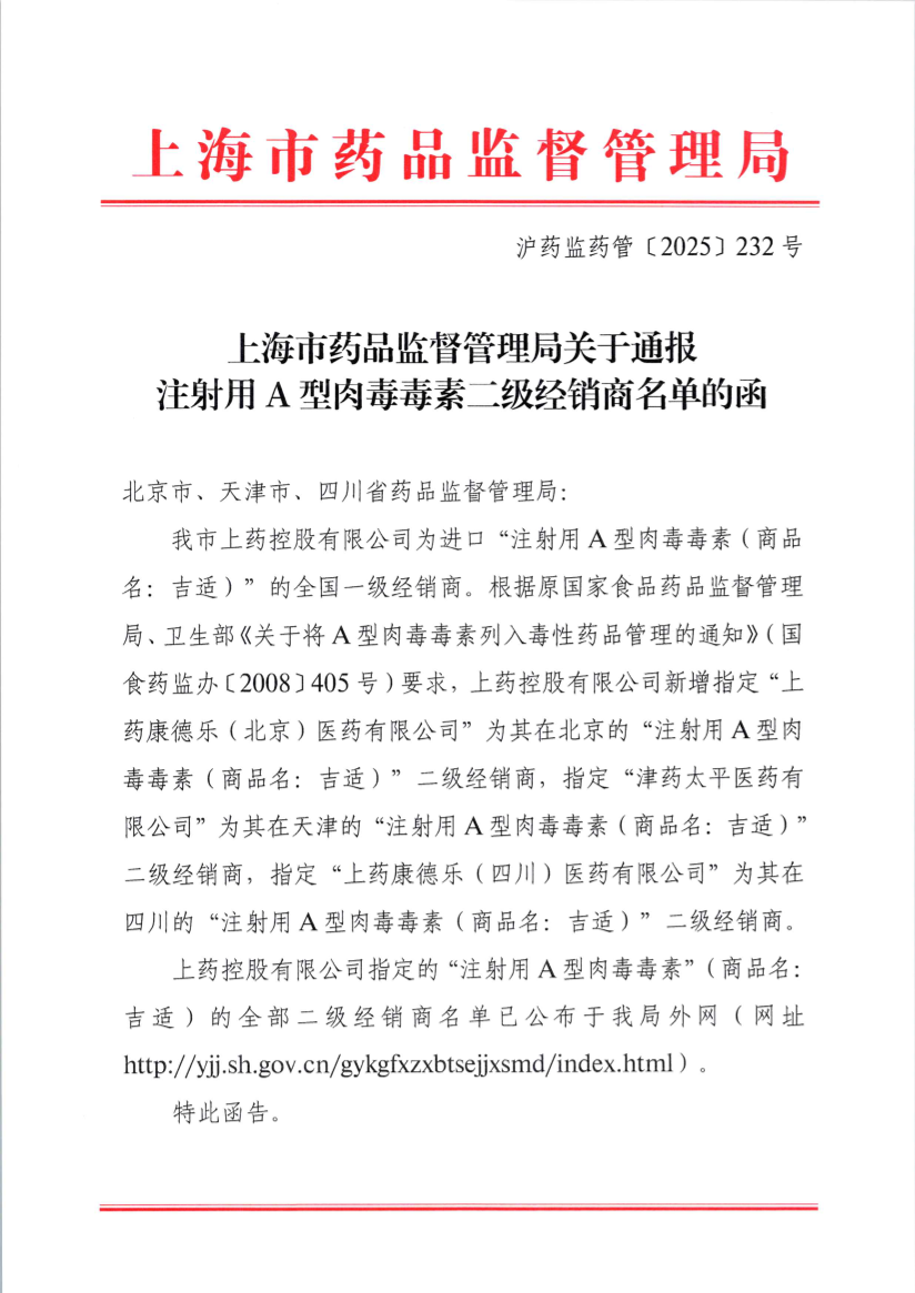 上药控股有限公司指定的“注射用A型肉毒毒素”(商品名:吉适)的全部二级经销商名单已公布于我局外网(网址http://yjj.sh.gov.cn/gykgfxzxbtsejjxsmd/index.html)。