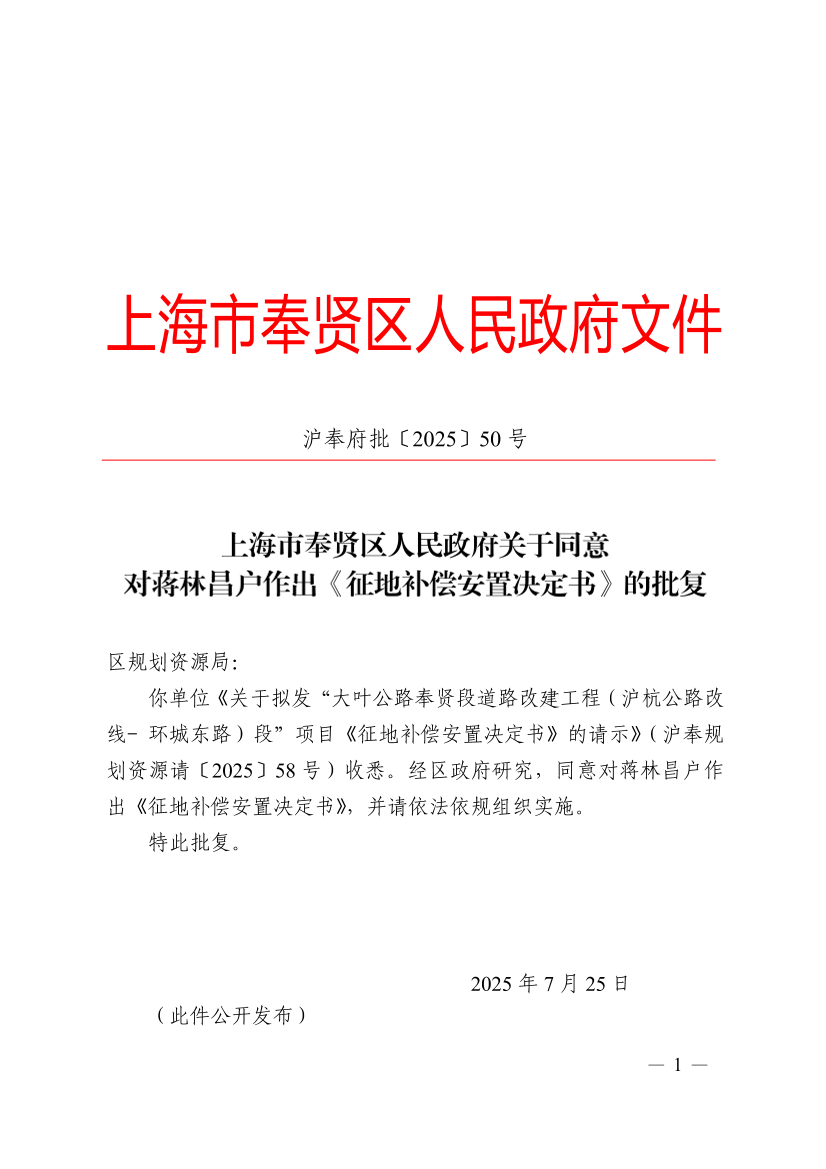 你单位《关于拟发“大叶公路奉贤段道路改建工程(沪杭公路改线- 环城东路)段”项目《征地补偿安置决定书》的请示》(沪奉规划资源请〔2025〕58号)收悉。经区政府研究,同意对蒋林昌户作出《征地补偿安置决定书》,并请依法依规组织实施。