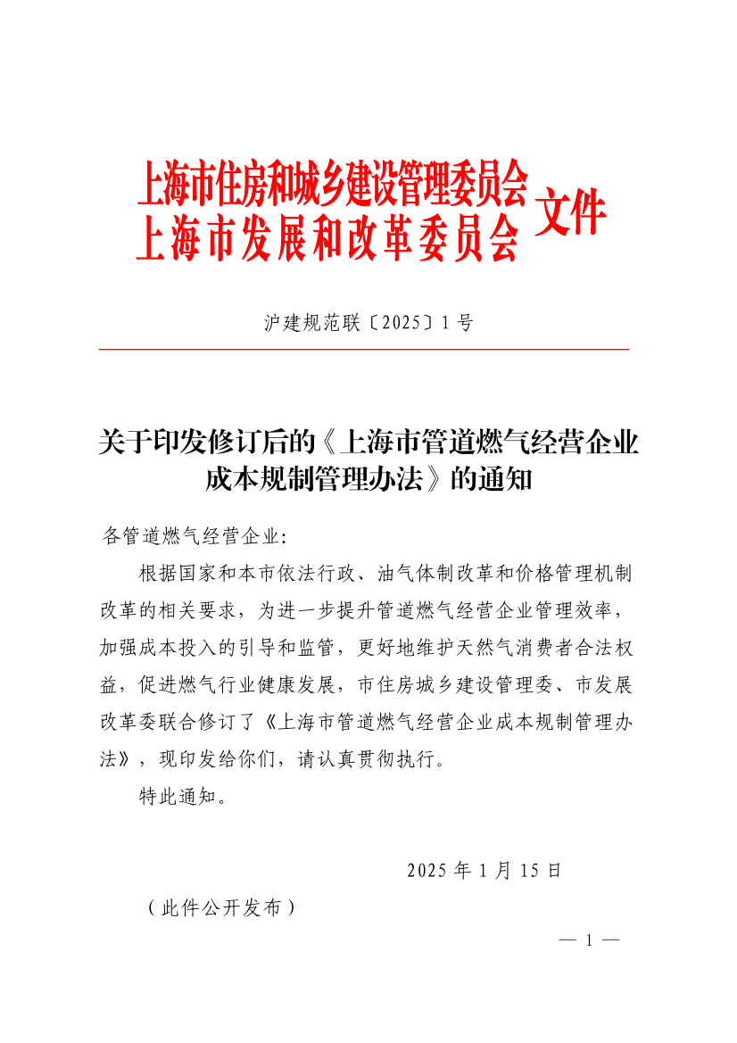 根据国家和本市依法行政、油气体制改革和价格管理机制改革的相关要求,为进一步提升管道燃气经营企业管理效率,加强成本投入的引导和监管,更好地维护天然气消费者合法权益,促进燃气行业健康发展,市住房城乡建设管理委、市发展改革委联合修订了《上海市管道燃气经营企业成本规制管理办法》,现印发给你们,请认真贯彻执行。