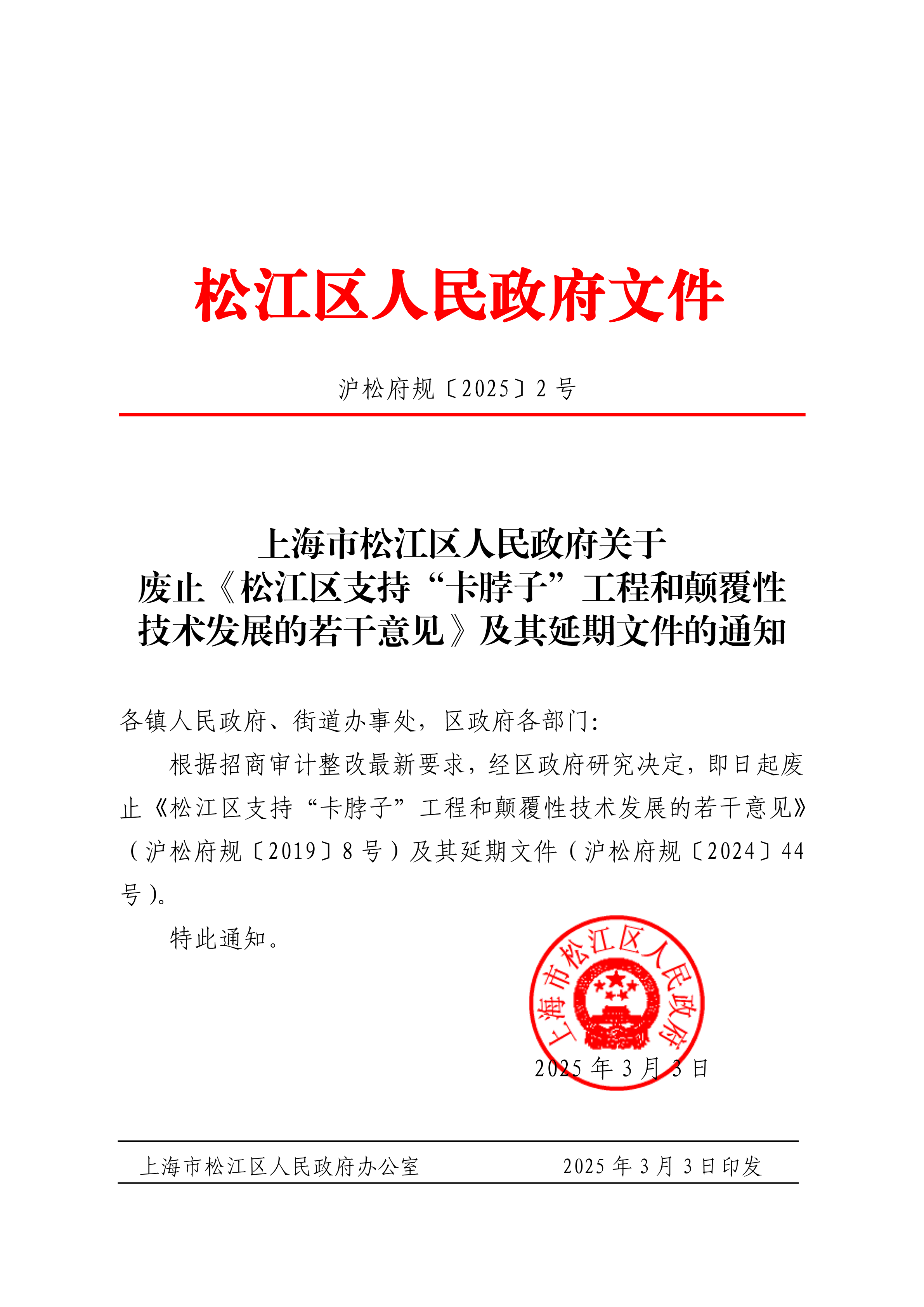 根据招商审计整改最新要求,经区政府研究决定,即日起废止《松江区支持“卡脖子”工程和颠覆性技术发展的若干意见》(沪松府规〔2019〕8号)及其延期文件(沪松府规〔2024〕44号)。
