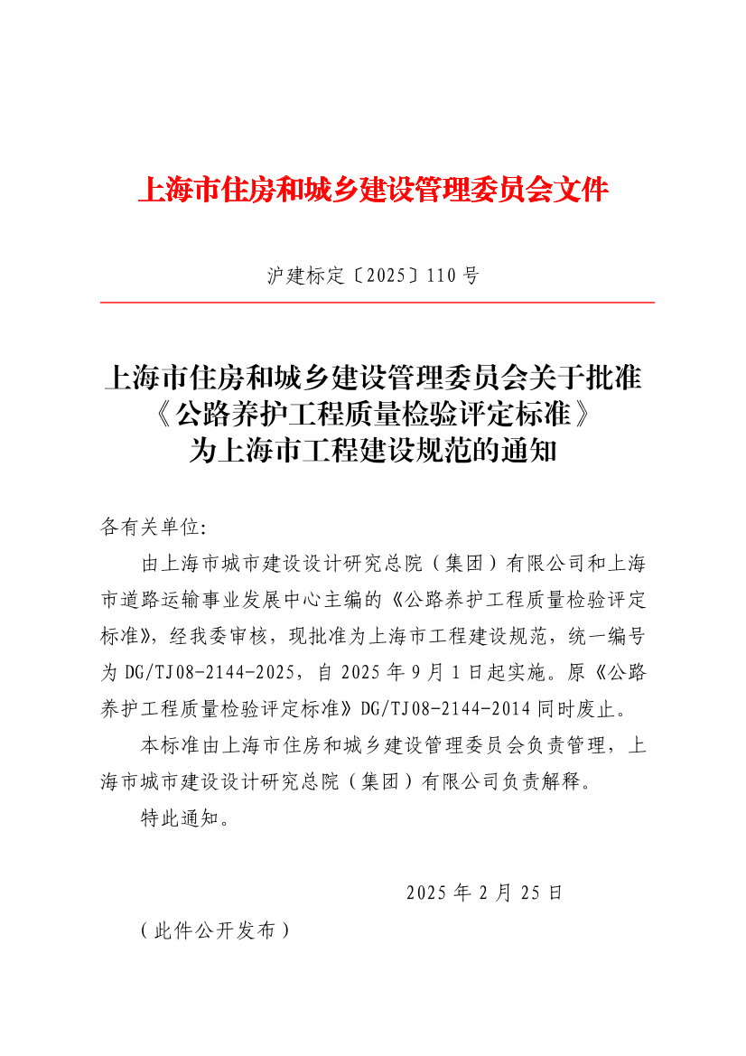 由上海市城市建设设计研究总院(集团)有限公司和上海市道路运输事业发展中心主编的《公路养护工程质量检验评定标准》,经我委审核,现批准为上海市工程建设规范,统一编号为DG/TJ08-2144-2025,自2025年9月1日起实施。原《公路养护工程质量检验评定标准》DG/TJ08-2144-2014同时废止。