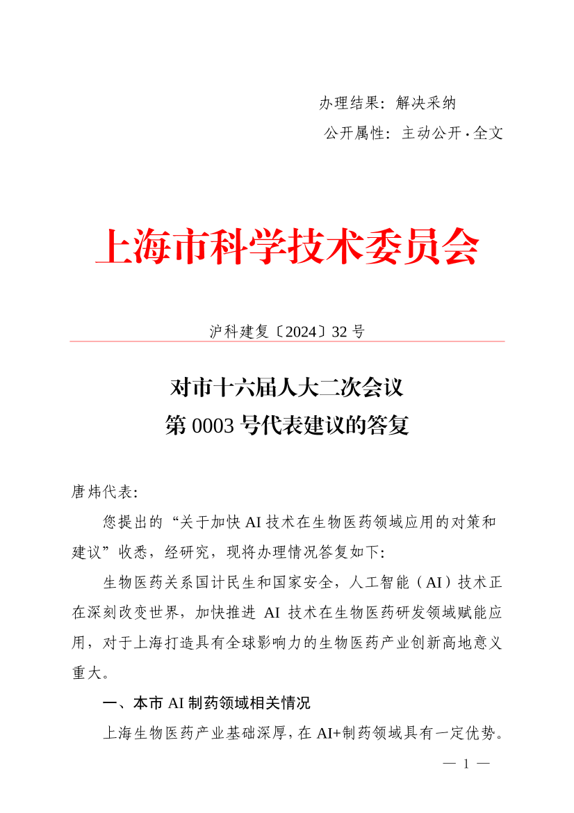 您提出的“关于加快AI技术在生物医药领域应用的对策和建议”收悉,经研究,现将办理情况答复如下:
