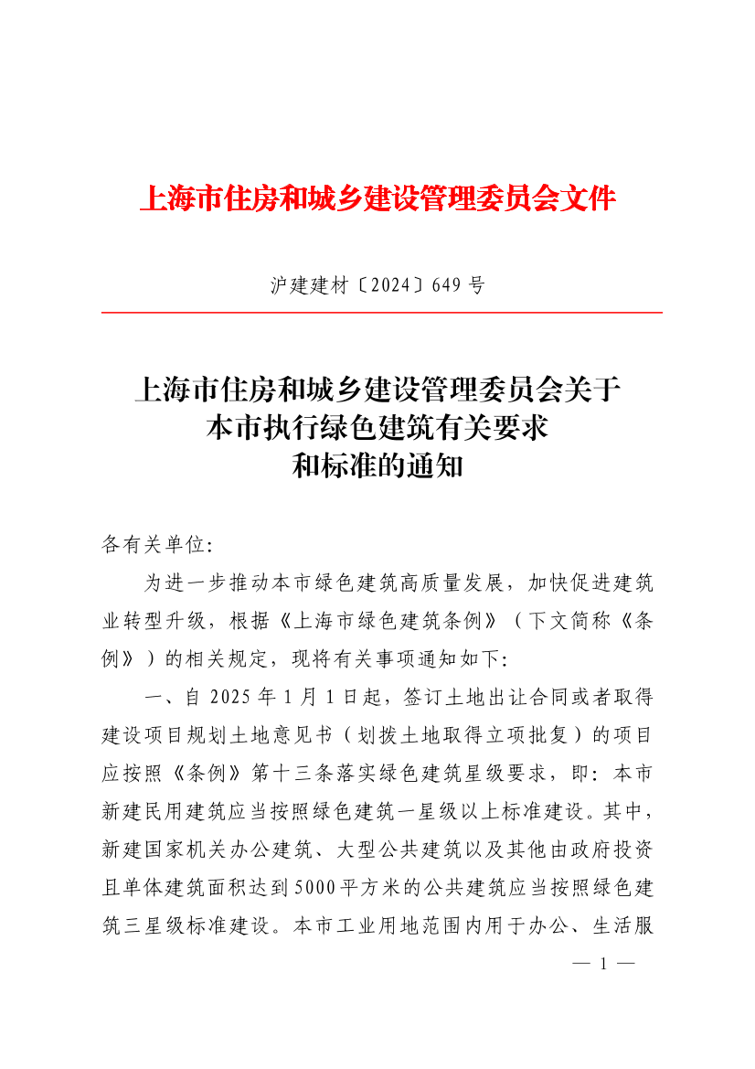 一、自2025年1月1日起,签订土地出让合同或者取得建设项目规划土地意见书(划拨土地取得立项批复)的项目应按照《条例》第十三条落实绿色建筑星级要求,即:本市新建民用建筑应当按照绿色建筑一星级以上标准建设。其中,新建国家机关办公建筑、大型公共建筑以及其他由政府投资且单体建筑面积达到5000平方米的公共建筑应当按照绿色建筑三星级标准建设。本市工业用地范围内用于办公、生活服务等非生产用途的新建建筑按照前文规定的绿色建筑标准建设。另外,绿色生态城区内的绿色建筑星级应符合该城区绿色生态专业规划的要求。