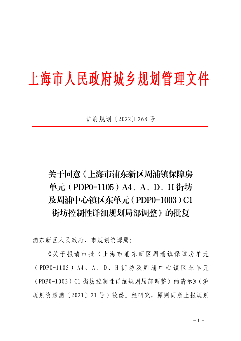 《关于报请审批〈上海市浦东新区周浦镇保障房单元(PDP0-1105)A4、A、D、H街坊及周浦中心镇区东单元(PDP0-1003)C1街坊控制性详细规划局部调整〉的请示》(沪规划资源浦〔2021〕21号)收悉。经研究,原则同意上报规划内容。