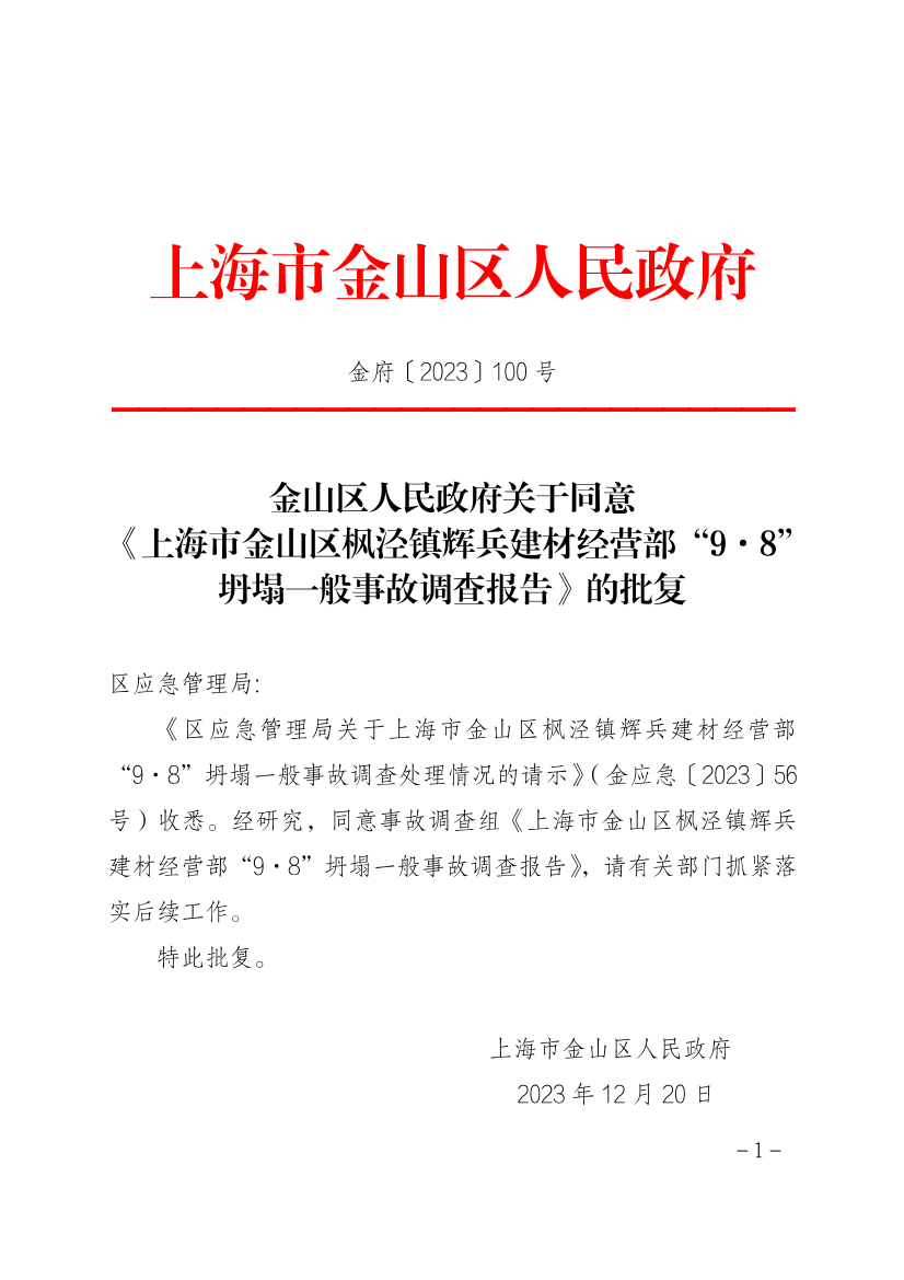 《区应急管理局关于上海市金山区枫泾镇辉兵建材经营部“9·8”坍塌一般事故调查处理情况的请示》(金应急〔2023〕56号)收悉。经研究,同意事故调查组《上海市金山区枫泾镇辉兵建材经营部“9·8”坍塌一般事故调查报告》,请有关部门抓紧落实后续工作。