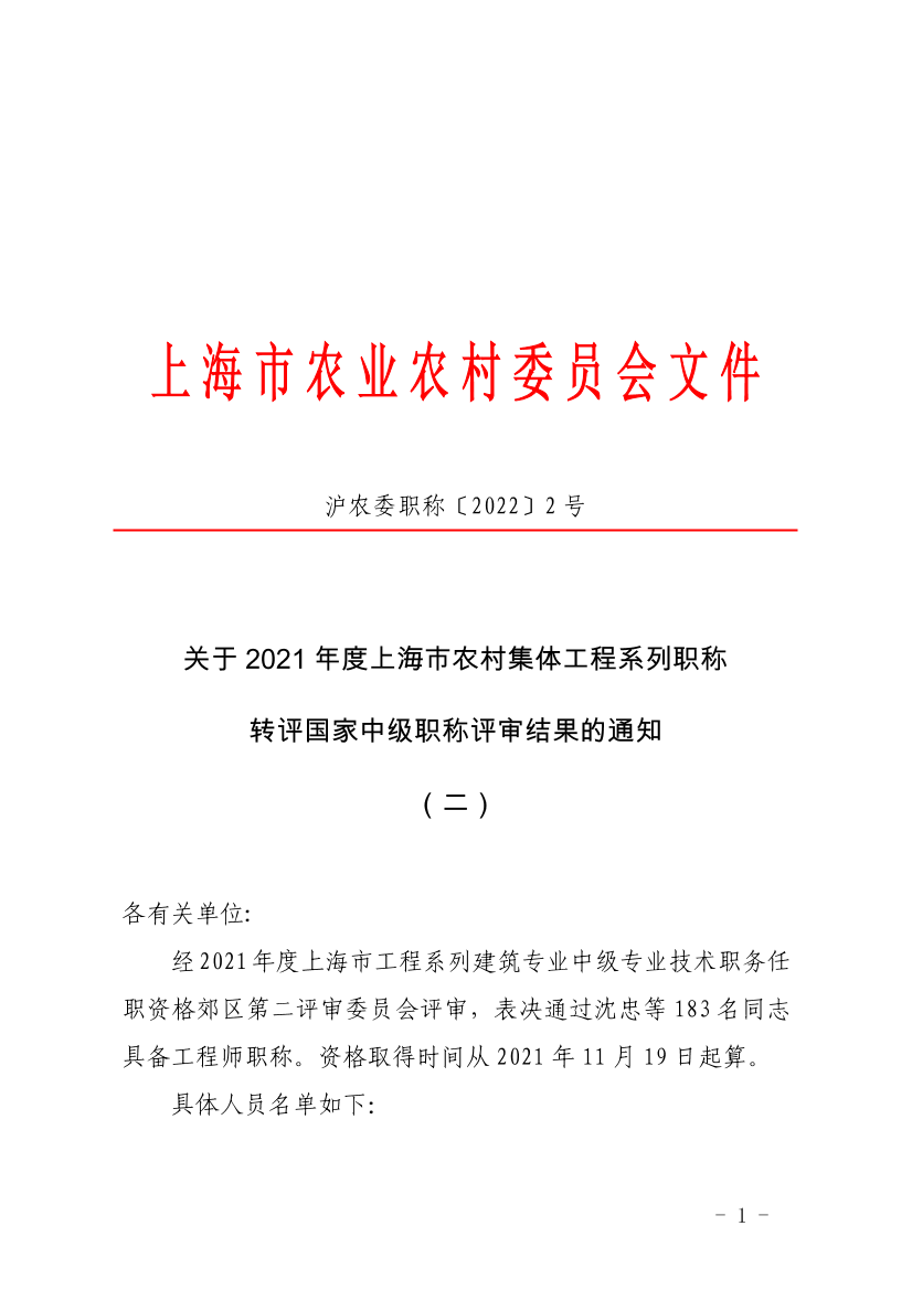 经2021年度上海市工程系列建筑专业中级专业技术职务任职资格郊区第二评审委员会评审,表决通过沈忠等183名同志具备工程师职称。资格取得时间从2021年11月19日起算。