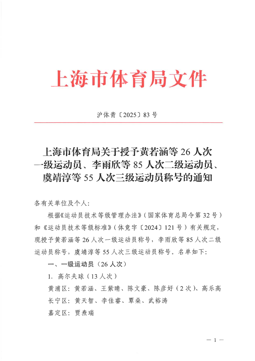根据《运动员技术等级管理办法》(国家体育总局令第32号)和《运动员技术等级标准》(体竞字〔2024〕121号)有关规定,现授予黄若涵等26人次一级运动员称号,李雨欣等85人次二级运动员称号,虞靖淳等55人次三级运动员称号。名单如下: